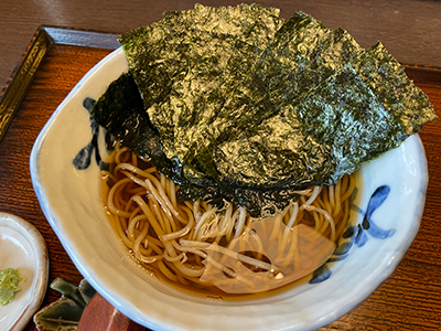 ご存じかと思うが、花巻そばとは、かけそばに焼きのりをのせたもので、のりを「磯の華」に例えた江戸時代から続くそばのレシピの一つだ。のりは、ちぎっても板のままでも提供する店によっていろいろある。通常、別皿でワサビが添えられる。そばとつゆがおいしいのはもちろんだが、のりしかのっていないので、そののりが良くないとどうしようもないそばだ。