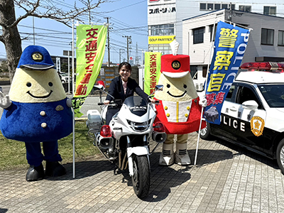 「私、白バイ隊員になりました!」…というのは冗談で、先日、秋田ノーザンハピネッツの試合会場で写真を撮って頂きました。秋田中央署のブースで白バイに乗る体験が出来たのですが、やはりかっこいいですね。