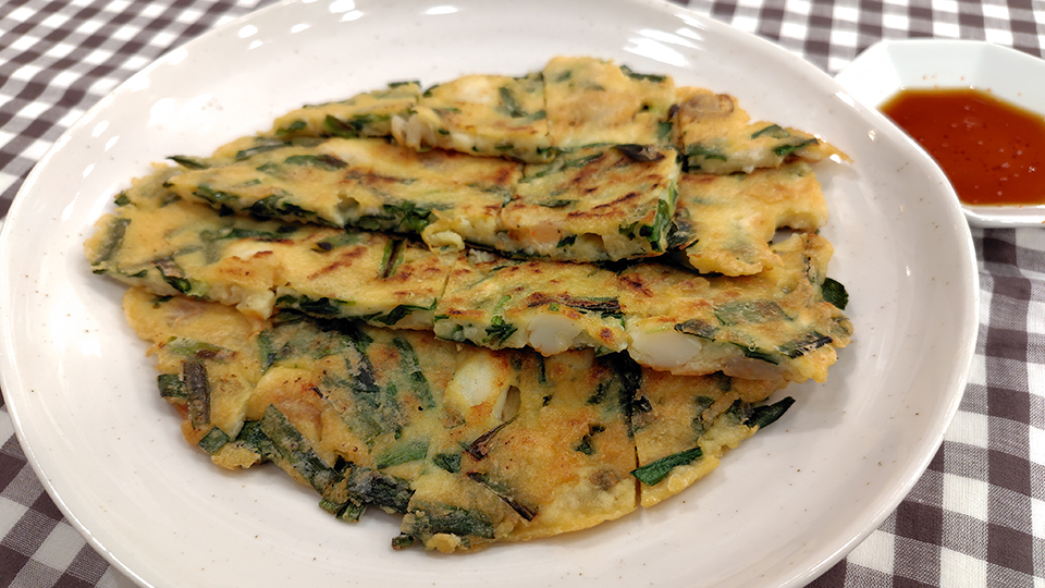 | 作り方 | [1] 水200ccに塩6gとシーフードミックスを入れて30分~1時間ほどおいて解凍する。ニラは3cmの長さに切る。 [2] ボウルに豆腐を握りつぶすようにくずし入れ、片栗粉、タマゴ、塩を加えてよく混ぜる。シーフードミックスとニラを加えてさっくりと混ぜ合わせる。 [3] フライパンにゴマ油を引いて熱し、生地を鍋底いっぱいに広げて中火で焼く。4~5分ほど焼いて焼き色がついたら上下を返しフライ返しで少し押さえ、焼き色がつくまで焼く。 [4] 食べやすい大きさに切り、器に盛る。ポン酢に一味唐辛子をふったタレにつけて食べる。 |