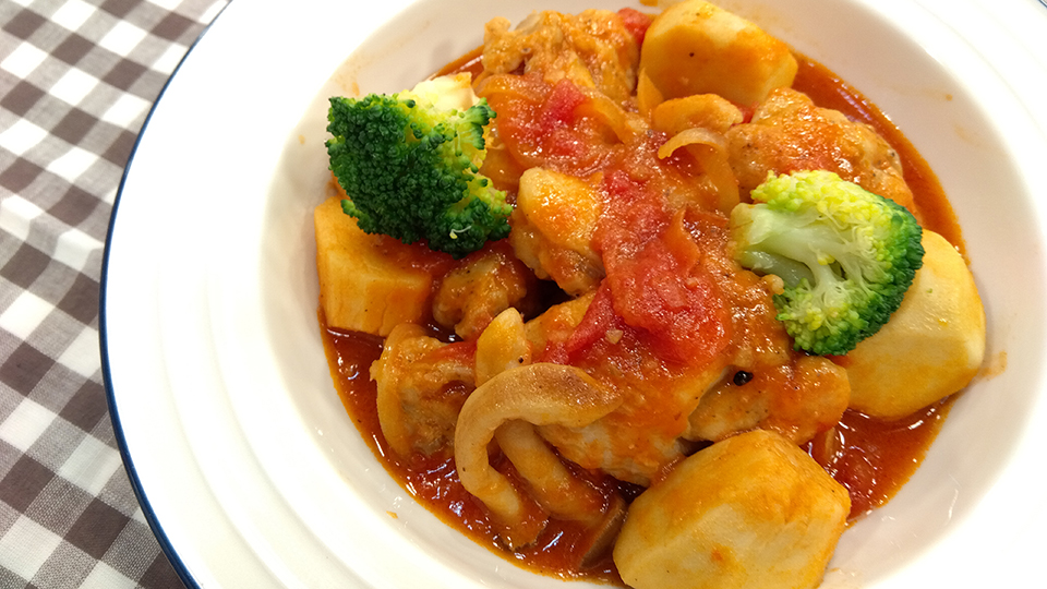 作り方 | [1] タマネギは薄切り、ニンニクはみじん切り、ブロッコリーはゆでる。サトイモは洗って皮をむき一口大に切る。多めの水を沸騰させて2分茹で、水洗いして水気を切る。 [2] 手羽元はペーパーで水気を取り塩コショウ、小麦粉をつける。 [3] フライパンにオリーブ油(大さじ1)を熱し手羽元を炒めて、軽く焼き色をつける。オリーブ油を大さじ1/2足し入れ、ニンニク、タマネギ、シメジ、塩を加えて炒める。 [4] 白ワインを加えアルコールをとばす。カットトマト、水、コンソメの素、サトイモ、ローリエを加えて煮立ててアクを取る。蓋をして弱火で15~20分煮る。 [5] 塩コショウで味をととのえる。 [6] 器に盛り、ブロッコリーを添える。 |