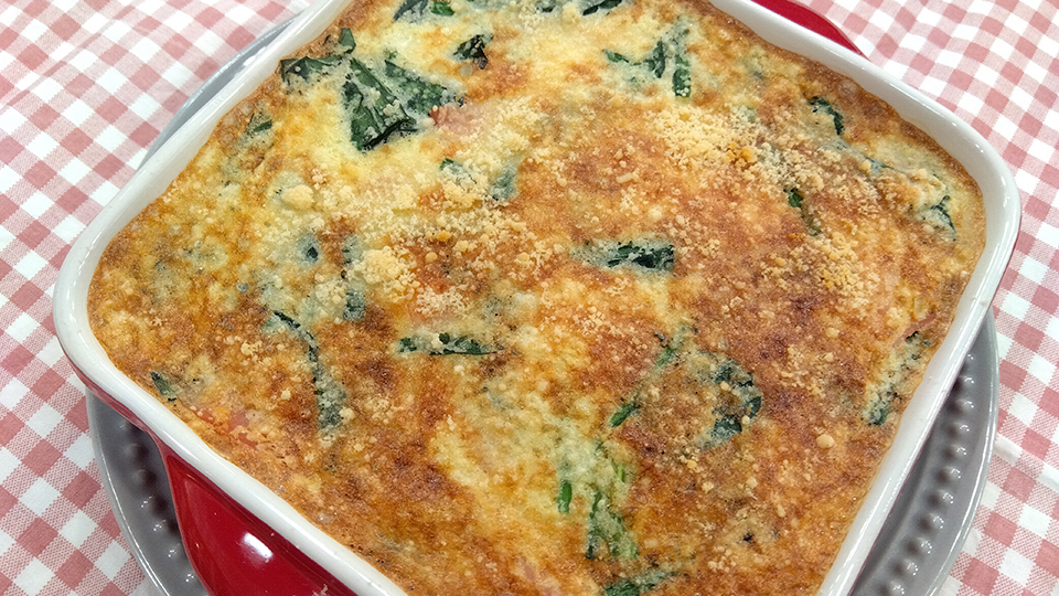 | 材料(2人分) | 長芋(皮をむいたもの)・・・150g ほうれん草・・・100g ピザ用チーズ・・・50g ベーコン・・・30g タマゴ・・・1個 白だし・・・小さじ1 粉チーズ・・・適量 |