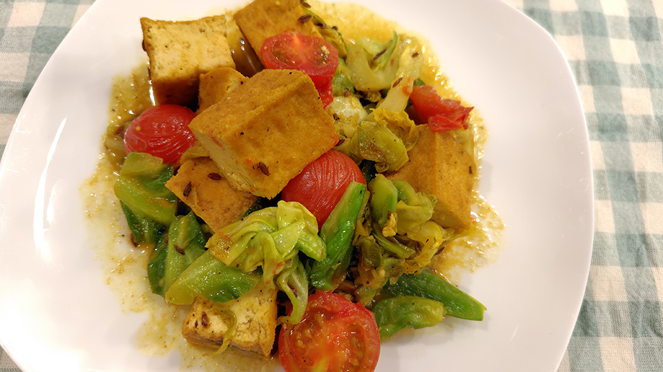 | 作り方 | [1] キャベツはざく切り。厚揚げは2cm位の角切り。ミニトマトは半分に切り、ピーマンは細切りにする。 [2] フライパンを中火にかけ熱し、サラダ油をひき、クミン(ホール)を入れ、焦げないように気を付けながら炒め、香りが出たらキャベツと厚揚げを入れて1分ほど炒める。 [3] ニンニクを入れてさらに1分ほど炒める。 [4] 鶏ガラスープの素、クミン(パウダー)、コリアンダー、ターメリック、ブラックペッパー、塩を加え2〜3分ほど炒める。 [5] お湯、ミニトマト、ピーマンを加えてふたを閉め、1分ほど煮る。 |