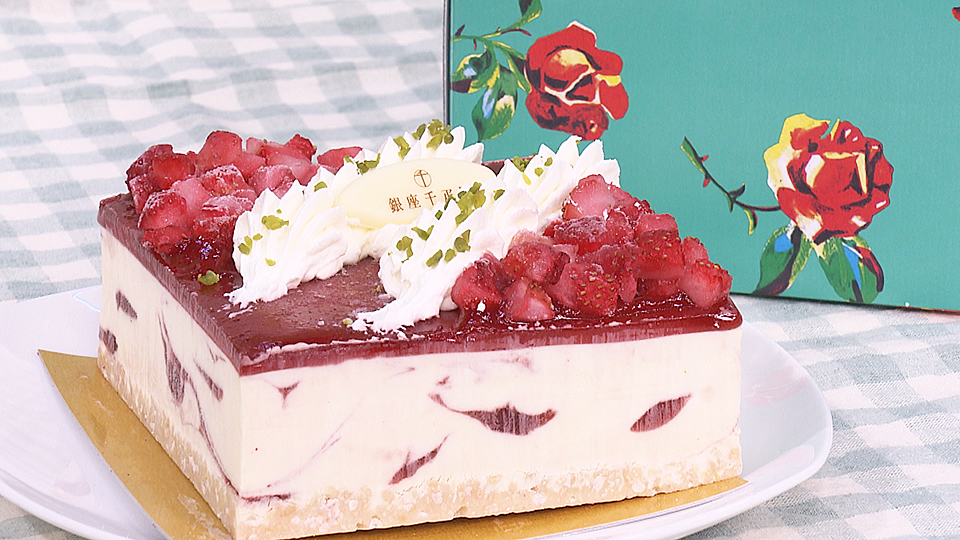 銀座千疋屋のアイスケーキは濃厚なバニラアイスにストロベリーソースが相性抜群です。