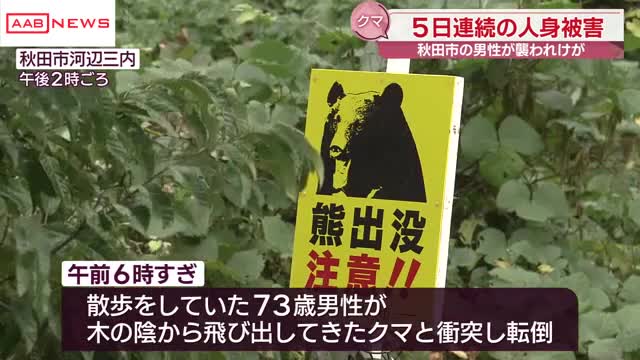 午前8時すぎ五城目町大川谷地中地内で、男性が畑に行こうと玄関から外に出たところ庭木に隠れていた体長およそ1mのクマに襲われました。男性は右ひじをひっかかれたり尻をかまれたりして、秋田市内の病院に搬送されました。男性は会話ができる状態で命に別状はありません。男性を襲ったクマはそのあと立ち去り、警察は現場周辺を警戒し住民に注意を呼び掛けています。クマによる人身被害は24件、25人に上り、今月に入ってからは6件、6人と相次いで発生しています。